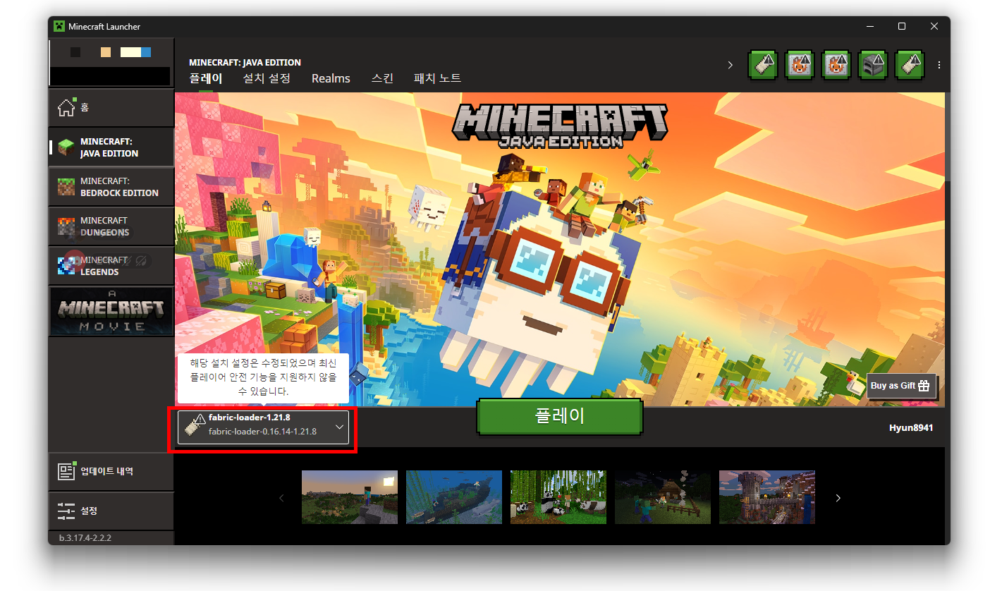 빨간색 박스 안에 있는 Minecraft Version 은 마인크래프트 버전을 뜻합니다. 원하시는 버전을 선택해 주세요.