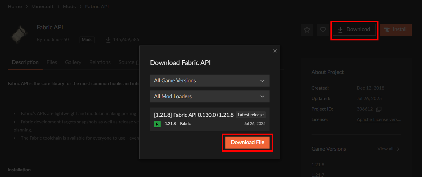 위 링크를 눌러 Fabric API를 다운로드합니다. (CurseForge)
